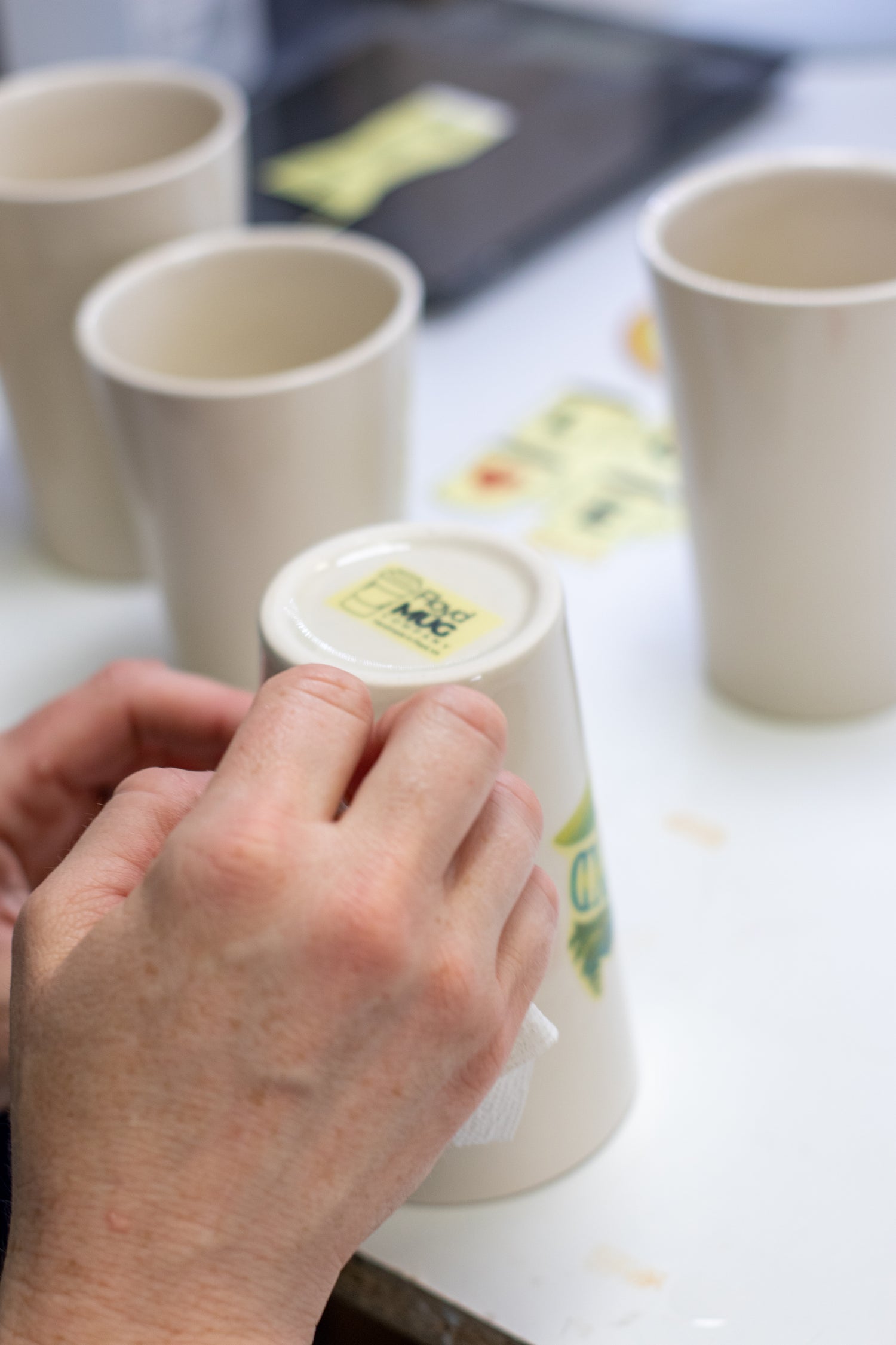 Next comes the decal process. We design each decal in Photoshop and print them with ceramic toner before laminating them to a flux sheet. They are cut out, floated in water, and applied to the cups one at a time. Using a flexible rib, each decal is smoothed into place so it bonds cleanly to the surface.