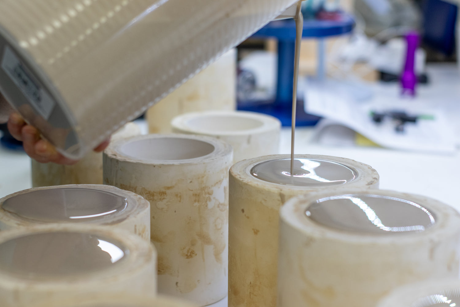 We begin by mixing our own slips and glazes from dry raw ingredients, ensuring complete control over the quality and character of the finish. Each mold is crafted in-house from pottery plaster and water. Once a cup is removed from the mold, it goes onto the potter’s wheel where the rim is carefully cleaned and smoothed by hand.